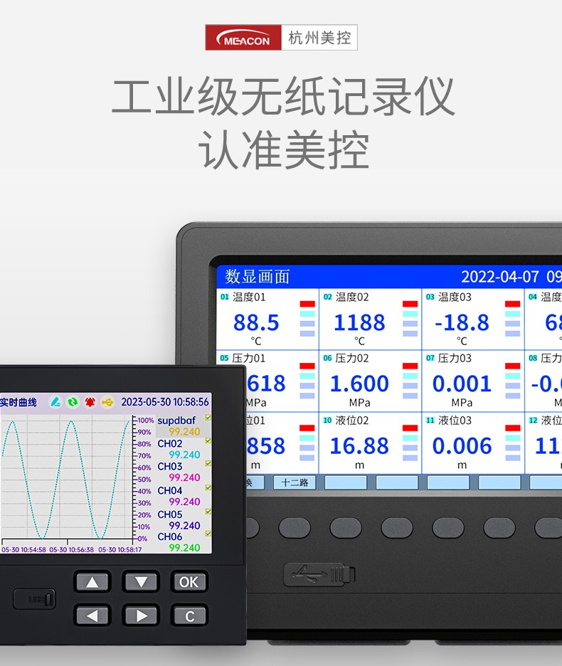本产品为工业无纸记录仪,配置 3.5 英寸 TFT 真彩全视角液晶显示屏。可以接入多种类型的电流、电压、热电偶和热电阻等工业标准信号,实现温度、湿度、压力、液位、流量的显示、记录、超限监控、报表、数据通讯、信号变送以及流量累积、流量温压补偿等功能。可应用在冶金、石油、化工、建材、造纸、电力、食品、制药、工业水处理等各个行业。