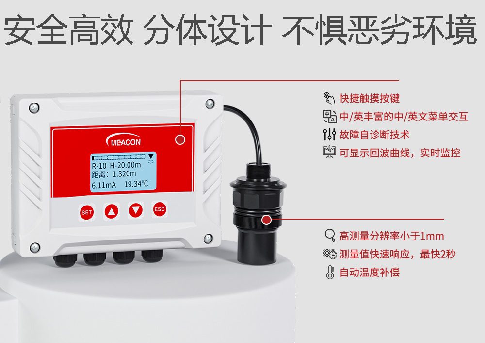 MIK-DFG分体式超声波液位计利用发射超声波经物位或液位,反射后所需要的时间来计算距离。
