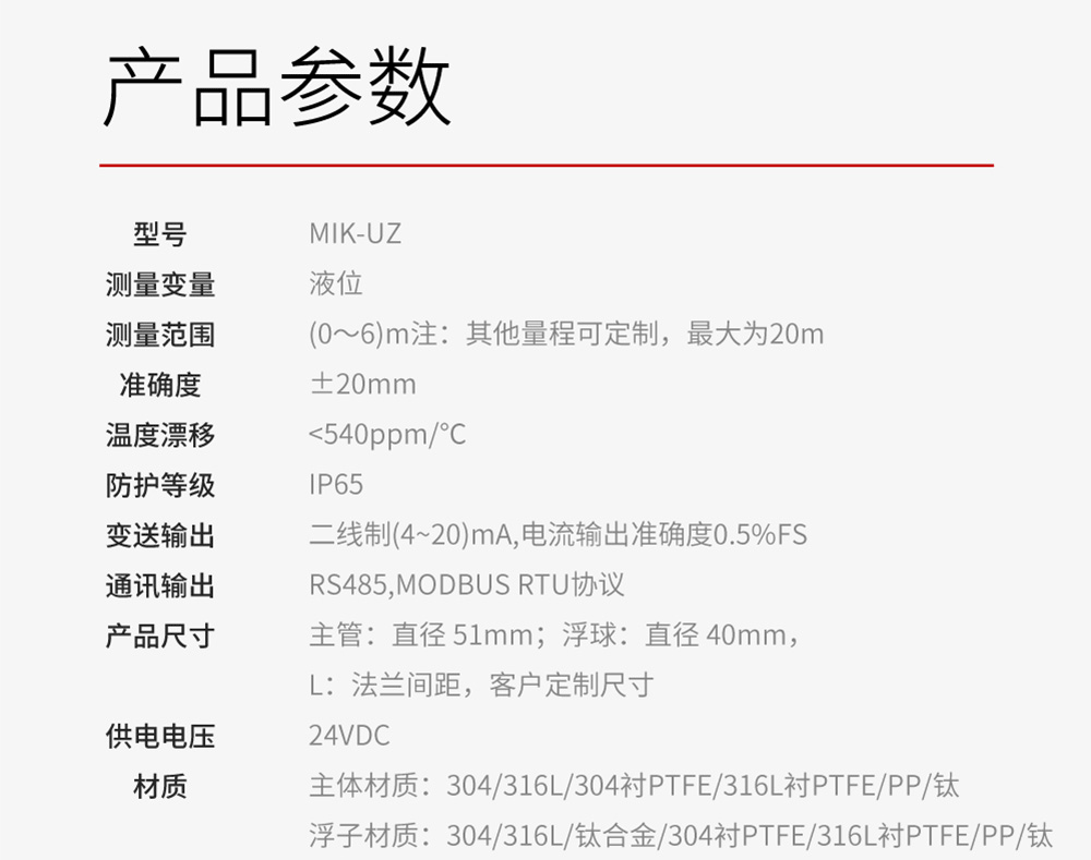 MIK-UZ-B磁翻板液位计根据浮力原理,浮子在测量筒内随液位的升降而上下移动,浮子内的永久磁钢通过磁耦合作用,驱动红白翻柱翻转 180°,液位上升时,翻柱由白色转为红色,下降时由红色转为白色,从而实现液位的指示。