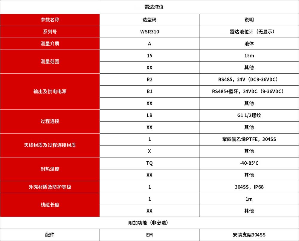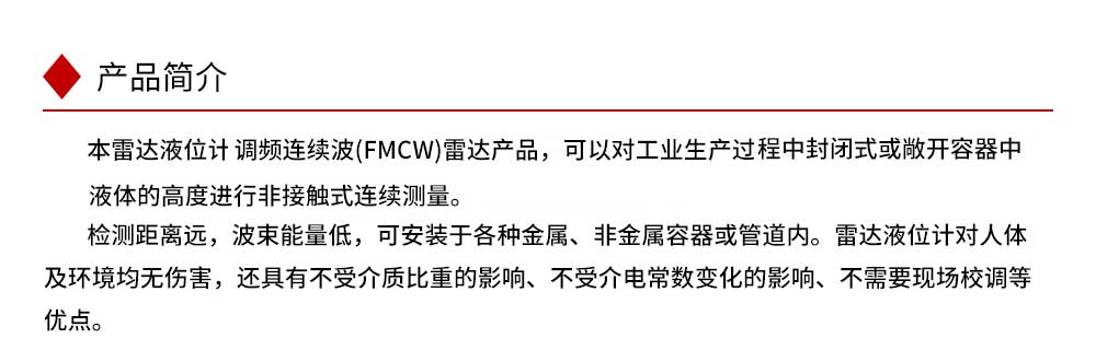 WSR310雷达液位计是调频连续波(FMCW)雷达产品,可以对工业生产过程中封闭式或敞开容器中液体的高度进行非接触式连续测量。 检测距离远,波束能量低,可安装于各种金属、非金属容器或管道内。雷达液位计对人体及环境均无伤害,还具有不受介质比重的影响、不受介电常数变化的影响、不需要现场校调等优点。