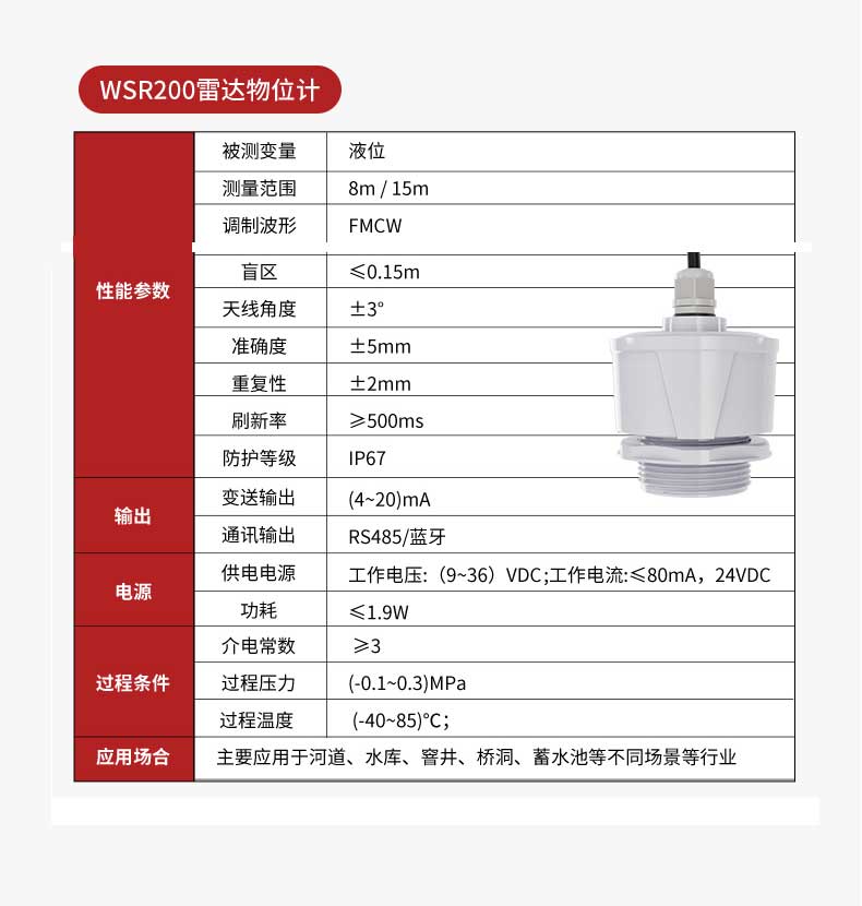 本产品波束能量低,对人体及环境均无伤害,还具有不受介质比重的影响、不受介电常数变化的影响、不需要现场校调等优点,广泛应用江河、水库、湖泊、灌渠、河道等自然水域水文监测场合。